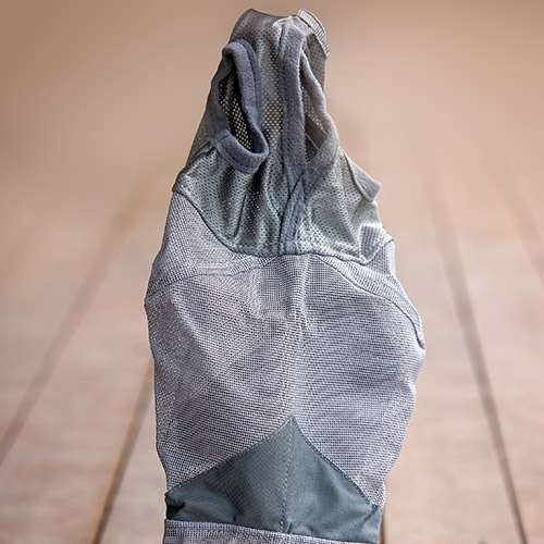 Soft coated nylon micro mesh blocks 70% of the sun’s damaging UV rays and protects the sensitive, soft tissues of the eyes and forehead.